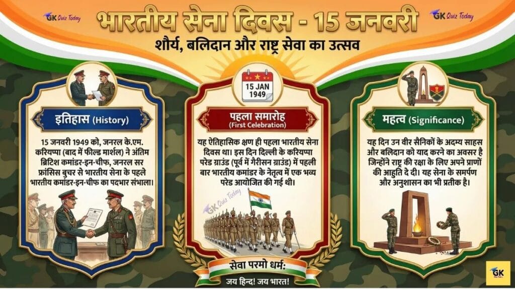 उत्तर: भारतीय सेना दिवस हर साल 15 जनवरी को मनाया जाने वाला एक राष्ट्रीय समारोह है, जो फील्ड मार्शल के.एम. करियप्पा के भारतीय सेना के पहले भारतीय कमांडर-इन-चीफ बनने की याद में आयोजित किया जाता है।